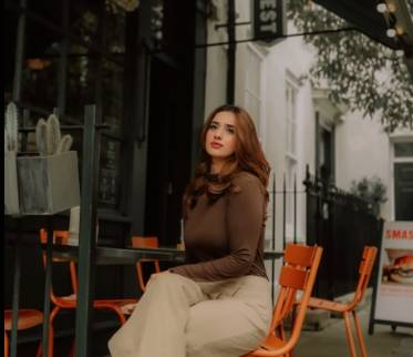 The shoot, captured in a historic part of the city, blended high-fashion sensibilities with street-style aesthetics. Alishba wore a dark brown fitted turtleneck paired with high-waisted beige trousers, featuring a wrap-over detail that added structure and sophistication. A bold oversized mohair scarf in shades of orange, yellow, blue, and pink added vibrancy to the earthy tones, while a Burberry Frances tote subtly paid homage to British heritage.