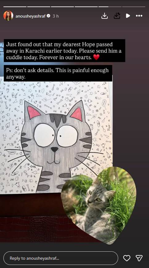 Pakistani VJ and actress Anoushey Ashraf shared a heartfelt message with her followers, announcing the passing of her cherished pet cat, Hope, in Karachi. The news has touched fans deeply, reflecting the affection many know she has for animals.