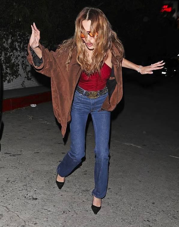 For the evening, Hadid exuded effortless style in a red halter top paired with blue jeans, cinched with a vintage Yves Saint Laurent woven belt. An oversized brown suede jacket and black pointed-toe heels completed her chic look. Her soft waves, orange-tinted sunglasses, and bold presence gave the runway star a casual yet fashionable vibe.