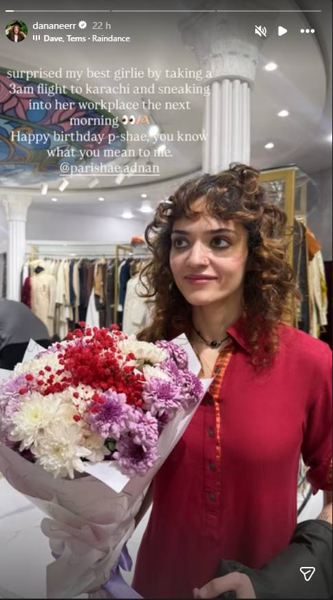According to social media posts, Dananeer took an early morning flight—either from Islamabad or Lahore at 3:00 AM—to ensure she could make Parishae’s day unforgettable. Arriving unannounced, she sneaked into Parishae’s workplace the following morning, presenting a stunning bouquet that immediately caught her friend off guard. Parishae’s reaction, shared online, revealed sheer disbelief and delight at the thoughtful surprise.