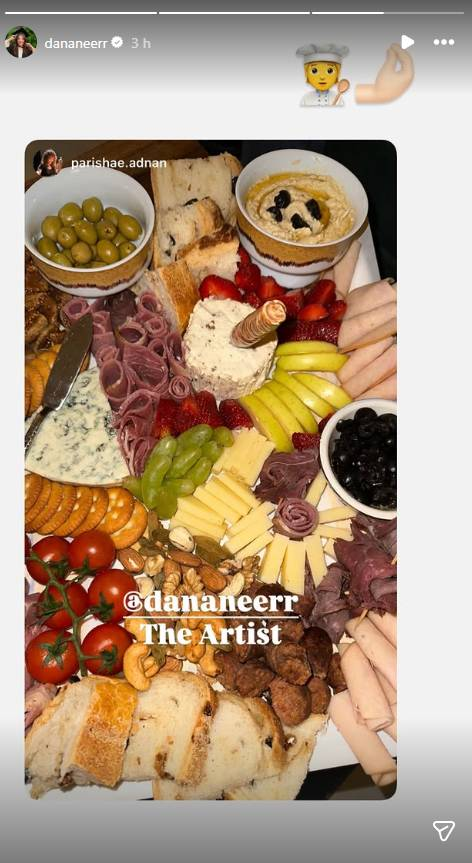 Dananeer didn’t stop at flowers. She curated an elaborate charcuterie board, featuring cheeses, grapes, olives, hummus, and assorted meats, playfully sharing the setup online under the caption “The Artist.” Her post included inside jokes referencing their wider friend group, such as “Missing Dr nefarious also” and “Major nafayal fomo,” adding warmth and humor to the heartfelt gesture.