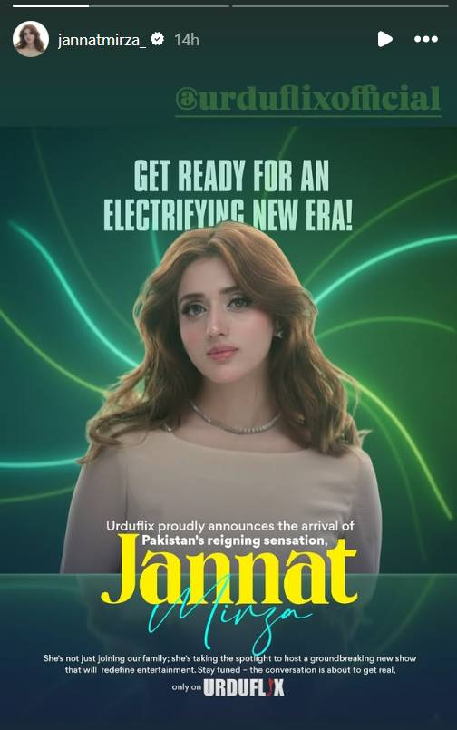 The TikTok star, who has already established herself as one of Pakistan’s most-followed social media personalities, shared the news through her Instagram story. She reposted Urduflix’s official announcement, which read: “Finally the wait is over! Jannat Mirza is all set to do our upcoming show. Stay tuned for the grand reveal – this one is going to be unforgettable!”