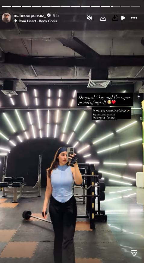 On Instagram, Mahnoor celebrated losing 4 kg (approximately 8.8 lbs) at the gym, posting a mirror selfie from her workout session in Lahore. Dressed in a light blue zip-up vest and black gym pants, she credited her coach, tagging @yourcoachowais, and highlighted the dedication behind reaching this milestone. The gym’s LED-lit futuristic interior and an upbeat track, Body Goals by Roni Heart, reflected her excitement and motivation.