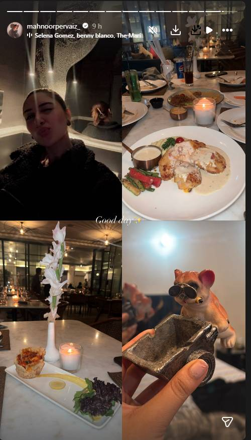 Later, Mahnoor shared a four-image collage from her evening, showcasing a chic restaurant mirror selfie, a beautifully plated grilled chicken main course, an elegant appetizer, and a quirky bulldog figurine décor. Accompanied by a Selena Gomez & benny blanco track, the posts highlighted her approach to rewarding herself after disciplined workouts, blending health with lifestyle enjoyment.