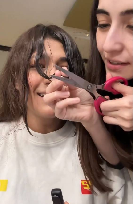 Their unconventional methods include using a wooden hairbrush as a guide and trimming inch-long sections at the back. Unsurprisingly, this led to moments of panic—especially when the back section accidentally took on a triangular shape, leaving Momina gasping while Merub laughed at her bold handiwork.