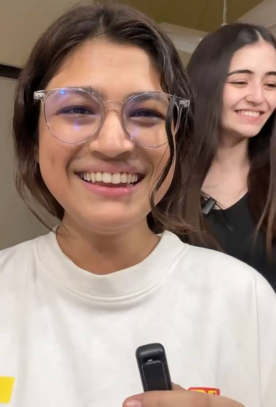 The most dramatic moment comes with the bangs. Spritzed generously with water, each snip is met with exaggerated reactions as Merub carefully works to adjust angles, jokingly comparing the initial cut to the nib of a fountain pen. After a few adjustments and a quick blow-dry, the chaotic process transforms into wispy bangs that perfectly frame Momina’s face. Relief quickly turns into excitement, with Momina admitting, “They’re not bad… so cute!”
