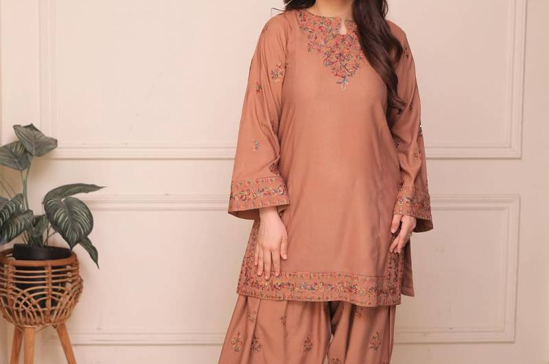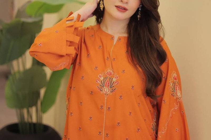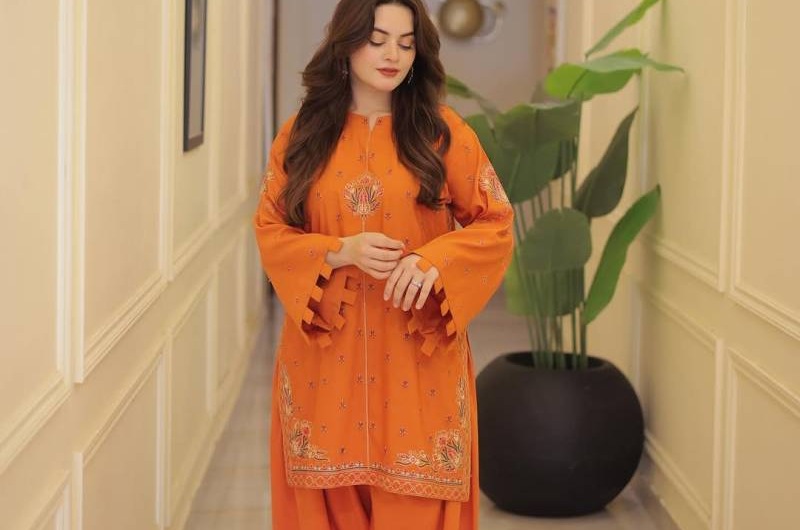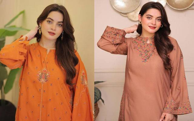 In one statement look, Minal wore an orange embroidered shirt paired with a matching farshi shalwar, creating a striking contrast between warm tones and detailed threadwork. Another look featured a peach embroidered shirt with a coordinating farshi shalwar, presenting a softer, pastel interpretation of seasonal fashion. She captioned her post by inviting followers to pick a favorite, calling the outfits the perfect winter shalwar-kurta combination.