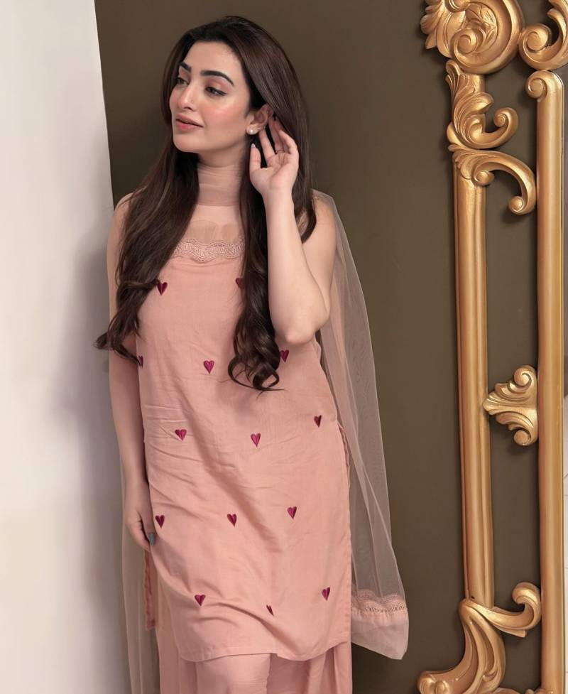 In the post, Nawal dons a soft peach traditional kurta adorned with embroidered maroon hearts, paired with a matching dupatta. Her choice of pearl stud earrings, a nose pin, and subtle rings complements the look, while her manicures—alternating between dusty blue and rich burgundy—add a modern, polished touch.