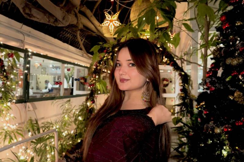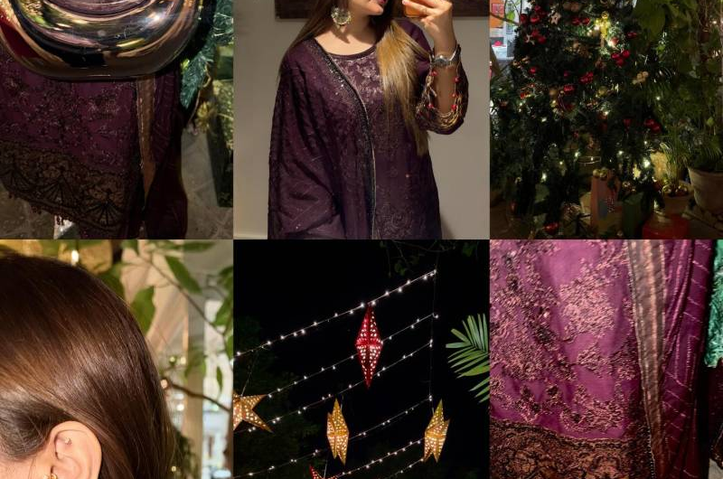 The event featured Rabeeca posing gracefully beside a lavishly decorated Christmas tree in an outdoor garden setting. She dazzled in a purple, heavily embellished shalwar kameez adorned with intricate sequins and delicate thread embroidery. A dark purple dupatta draped elegantly from her elbows complemented the floor-length outfit, while her glossy hair cascaded over one shoulder, framing a serene and radiant smile. The setting was enhanced with warm, star-shaped lanterns and lush greenery, creating a magical evening atmosphere.