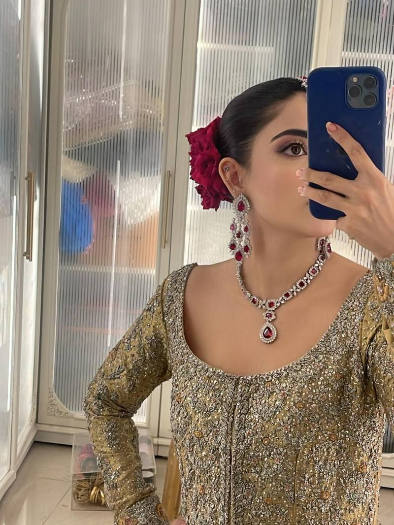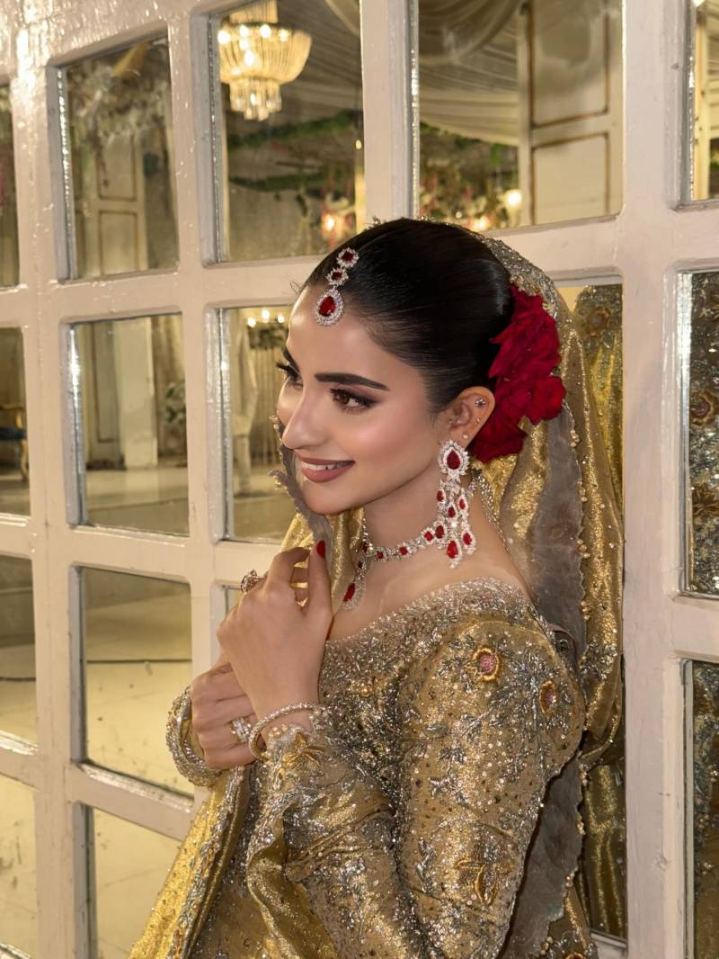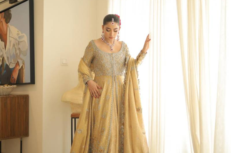 For the sequence, Saboor donned a champagne-gold pishwas designed by Farah Talib Aziz. The floor-length outfit featured intricate zardozi and tilla embroidery across the bodice and sleeves, creating a textured, shimmering effect that caught the light beautifully. A matching gold dupatta, edged with delicate embroidery, completed the ensemble, perfectly complementing the grandeur of the wedding scene.